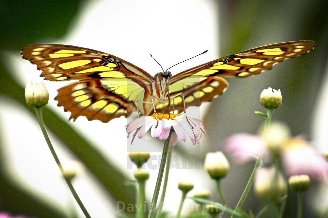 Line green and brown butterfly with it's wings outstretched.
